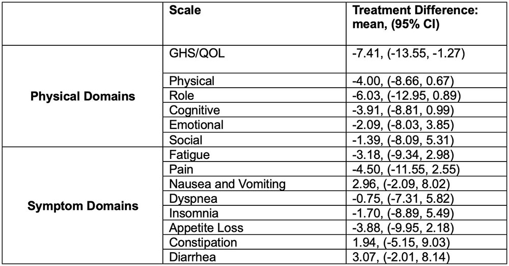 PRO analyses using EORTC QLQ-C30 and PRO-CTCAE tools revealed that patients in the ESR1m group treated with imlunestrant monotherapy demonstrated improved or maintained global health status (GHS)/quality-of-life (QOL) and physical function (PF) scores, while patients treated with SOC showed declines. Mean change from baseline favored imlunestrant: GHS/QOL (9.9 points) and PF (6.2 points). Mean differences in overall change from baseline also favored imlunestrant (Table). In the overall population, GHS/QOL scores declined similarly between imlunestrant and SOC (0.5-point difference), while PF scores were maintained with imlunestrant compared with a slight decline with SOC (2.5-point difference).